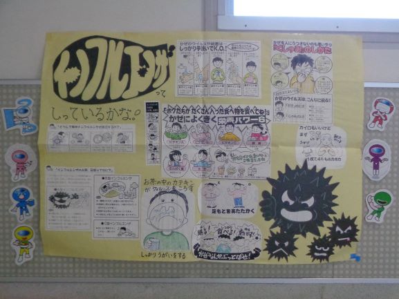 ①市内でもインフルエンザの流行が。3,4年生では保健指導で予防法を確認。