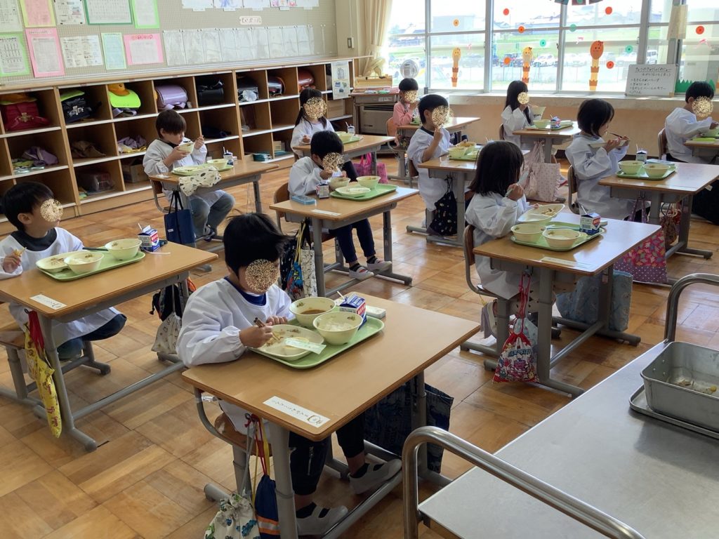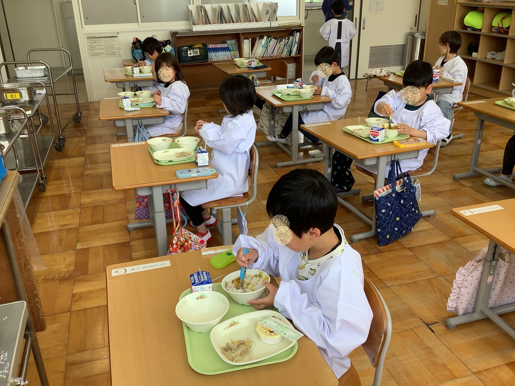 ③みんなで配膳した給食。初めての給食、少し緊張の様子でしたが、おいしかったかな!?